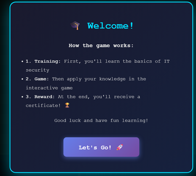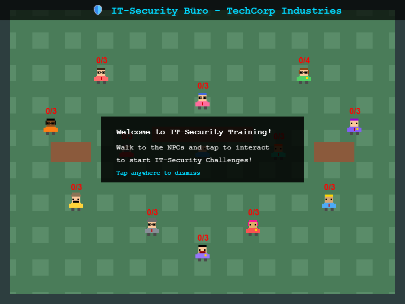 Learn IT security through an engaging retro-style game! Walk through a virtual office, talk to 12 security experts, and master 39 quiz questions covering essential cybersecurity topics.